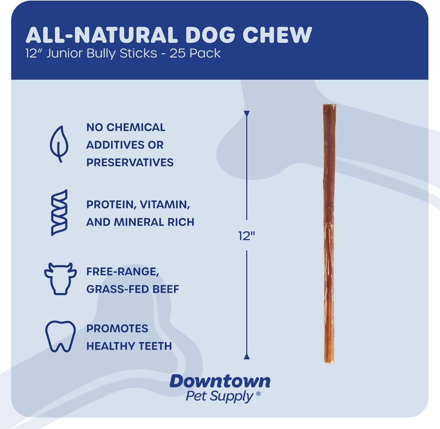Downtown Pet Supply Bully Sticks for Dogs, Junior Size (12″, 25-Pack) Rawhide Free Dog Chews Long Lasting Non-Splintering Pizzle Sticks – Low Odor Bully Sticks for Small Dogs