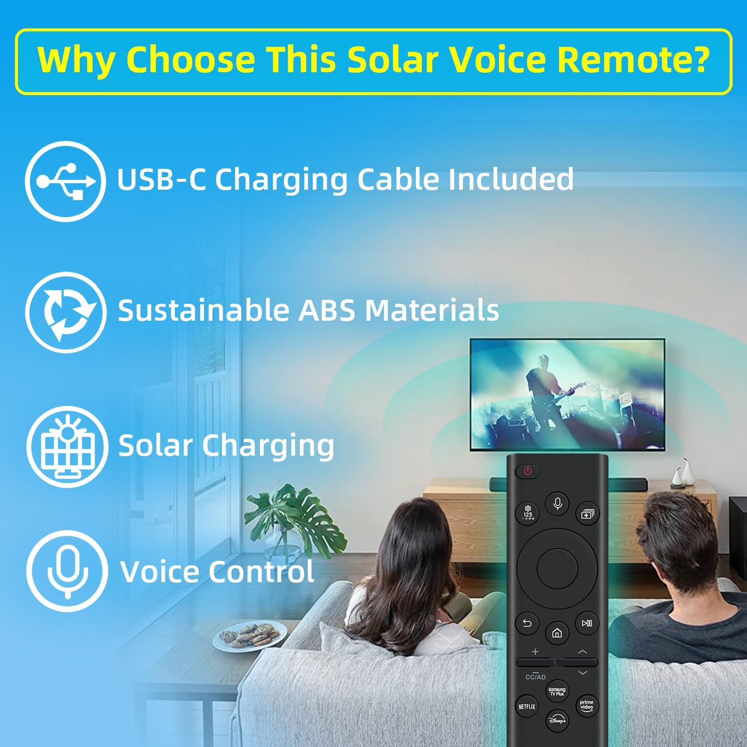【Solar Charging】This premium remote is a replacement for Samsung remotes with Solarcell charging Feature and Voice Control Function. This remote can be also be charged via USB-C port (USB-C Charging cable included in the package). No more batteries needed!!