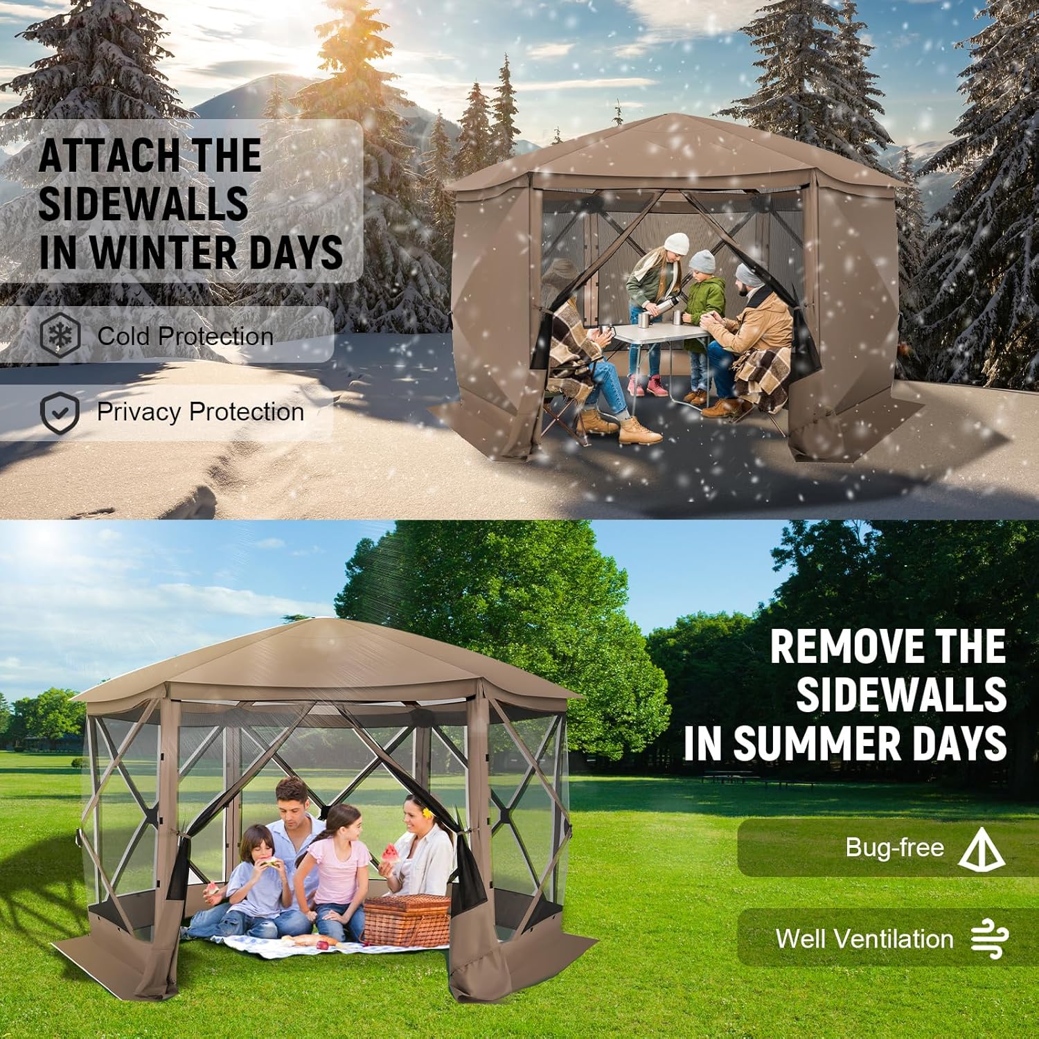 ✅【Versatile Removable Sidewalls】 Enjoy ultimate flexibility with our removable sidewalls. Attach them for complete privacy during outdoor activities, or remove them to benefit from high-density mesh that offers both fresh air and scenic views while effectively keeping mosquitoes at bay.