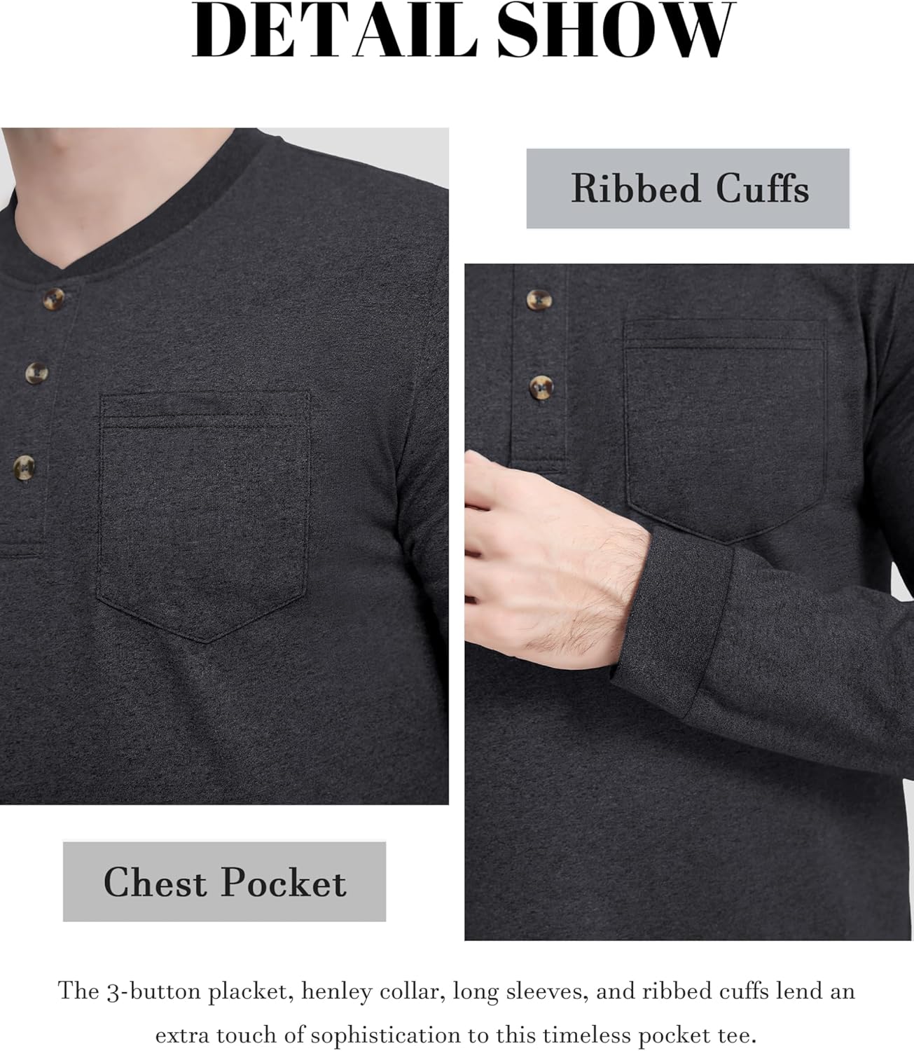 CRYSULLY Men’s Henley Shirts Cotton Long Sleeve T-Shirts 3 Button Pocket Tops Lightweight Casual Basic Tee