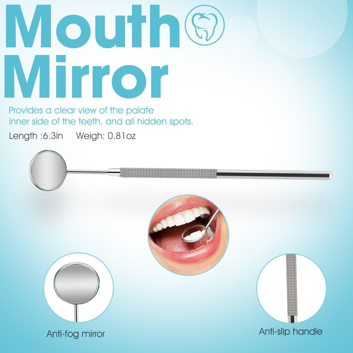 *Using our kit set is what you are looking forward to remove the dental calculus,tartar and stains. *Show the teeth white glory and healthy beauty. Instructions: 1.Dental mouth mirror Help you see the parts in the oral cavity that you can not see without tools. 2.Dental tweezer It can examine the tooth mobility by grasping the dental crown.You can remove the decomposed tissues and foreign bodies,pick up surgical dressing and medicine and clear food debris between the teeth with it. 3.Dental probe It can examine teeth defect range,tooth body hardness and the sense of dental tissues. You can find the sensitve points and the perforations easily with it.And you can use it as the tooth pick as well. 4.Hoe Shape Tooth Scraper It shapes like a hoe.It is easy for you to remove dental tartar,calculus and the plaque from the tooth surface and tooth root with the cutting edge of the scraper. 5.Sickle Shape Tooth Scraper It shapes like a sickle.With the thin-tipped part you can remove the dental tartar in the periodontal pocket and dental plague between the teeth andon the teeth surface easily. 6.Dental Stain Remover Both ends shape like spoon.It can deep down to the teeth root.And the special design helps you remove teeth stains caused by tea food and tobacco easily. Notes: 2.Please keep the products out of the reach of babies and children. 3.Not to share the kit set with others due to health concerns.
