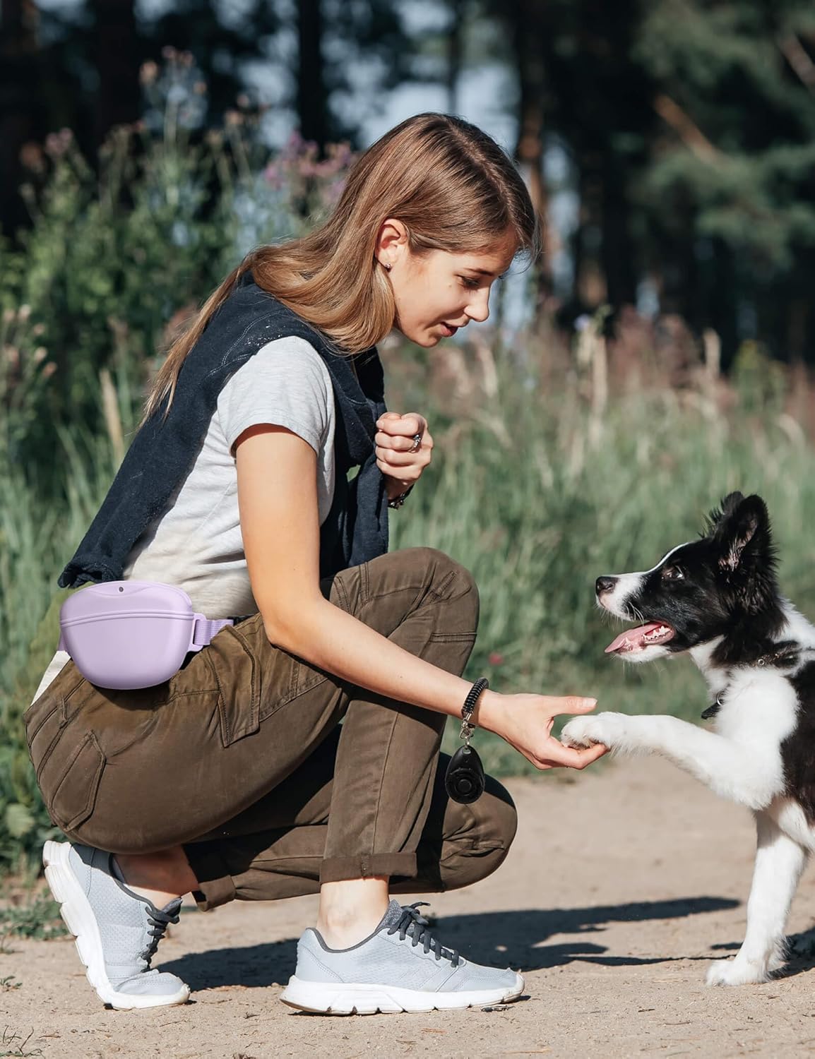 Dog Treat Pouch with Training Clicker, Upgrade Stronger Magnetic Closure to Avoid Spilling, 1.67 Cup Silicone Treat Bag Fanny Pack with Waist Belt for Pet Training Walking (Violet)