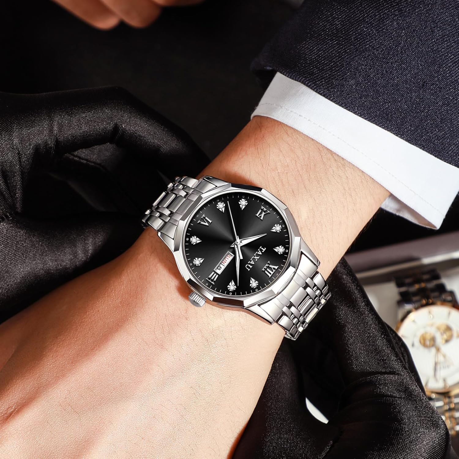 Dress Watch for Men Luxury Diamond Waterproof Big Face Men’s Watch Stainless Steel Fashion Classic Men Watches with Day Date Two Tone Silver Gold, Black, Blue, Blue Gold Face Relojes Para Hombres for Large Wrist