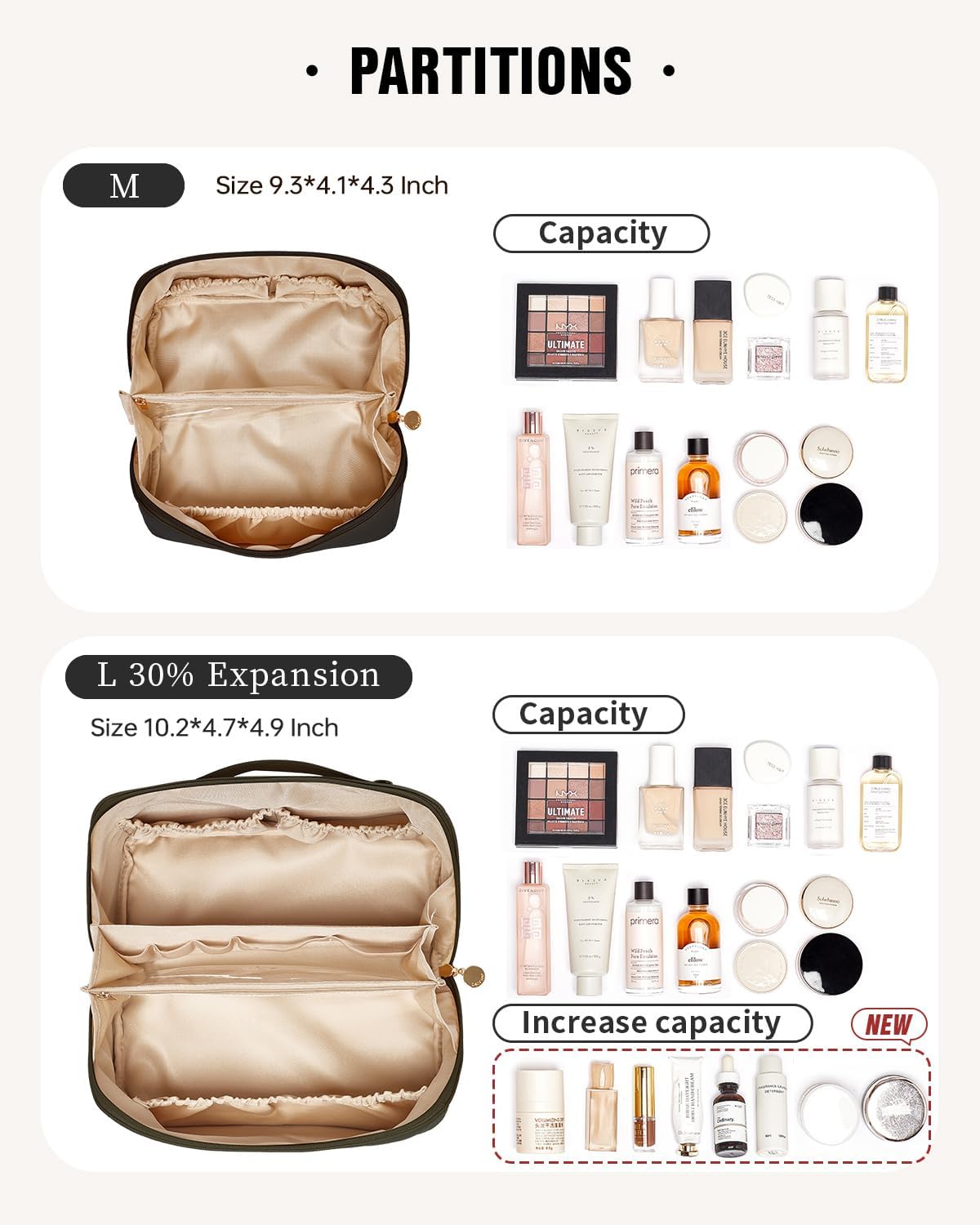 Our makeup bag has multiple pockets to organize and locate cosmetics. Specifically designed for smaller items like lipsticks, brow pencils, and eyeshadow palettes. Durable materials ensure pockets won’t wear or tear.