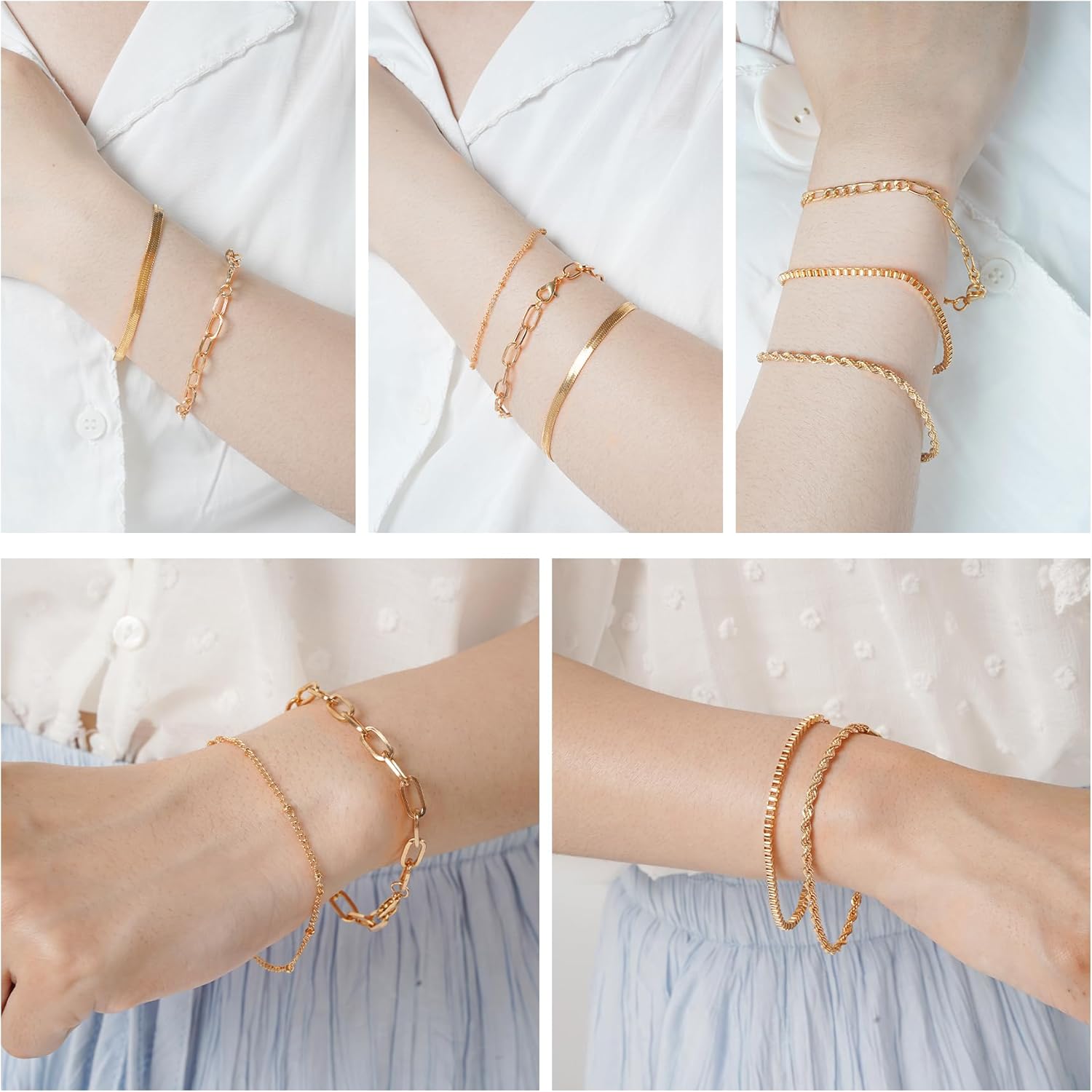 Gold Bracelets for Women, 6PCS 14K Real Gold Plated Dainty Bracelets Stack, Adjustable Layered Stackable Ankle Bracelets Jewelry Set Gifts for Women