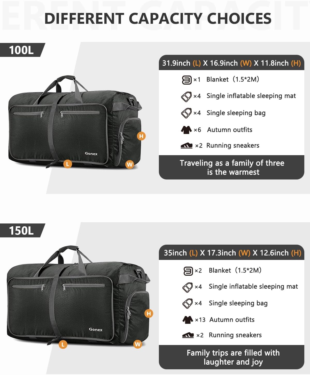 Gonex 40L 60L 80L 100L 150L Large Foldable Travel Duffle Bag with Shoes Compartment, Packable Lightweight Water Repellent Duffel Bag for Camping Gym Weekender Bag