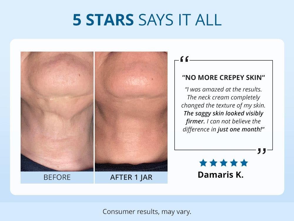 NECK AND CHEST FIRMING: Extend the benefits beyond your neck with our versatile formula. Our neck and chest firming cream helps improve the appearance of sagging skin in both areas, enhancing your overall youthful look.