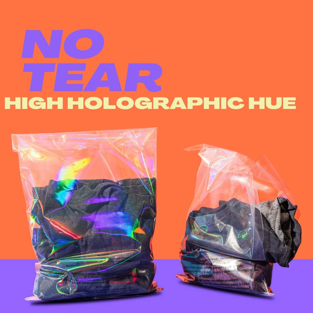 Holographic Resealable Bags For Small Business – These Cellophane Bags Self Adhesive For Convenient Packaging And Poly Bags With Suffocation Warning Offer A Premium Customer Experience – 10×13″ 100 pk