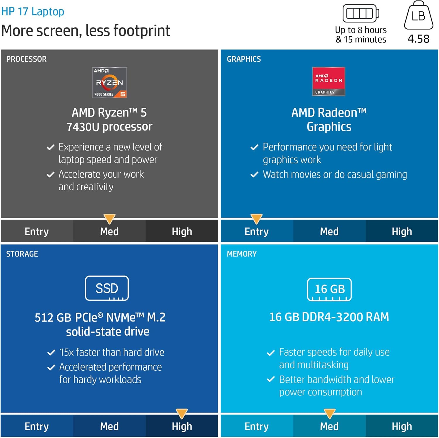 HP 17 inch Laptop, Microsoft Office 2024 Lifetime License & Windows 11 Pro, AMD Ryzen 5 7430U Processor, 16 GB RAM, 512 GB SSD, 17.3″ FHD Display, AMD Radeon Graphics, Long Battery Life, Anti-Glare
