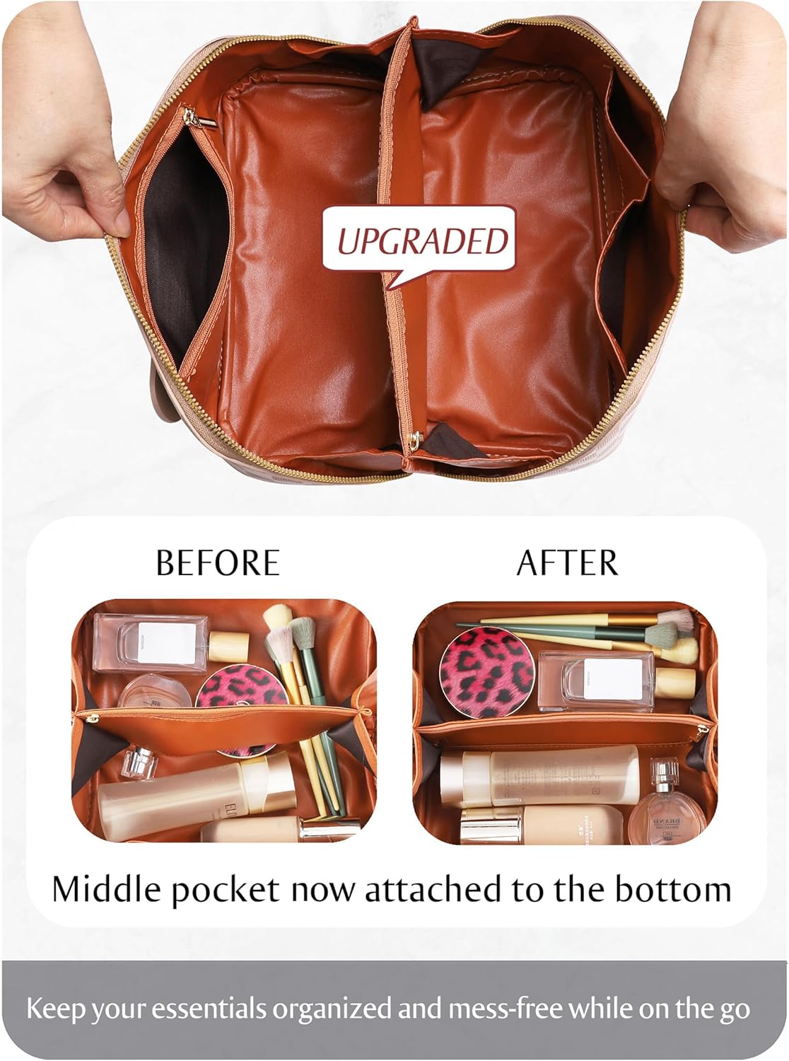 Customers find the cosmetic bag roomy, holding both makeup and brushes, and appreciate its chic style with cute interior colors. The bag is sturdy, practical, and easy to carry, making it convenient for travel. The zipper quality receives mixed feedback – while some find it sturdy, others report it breaking immediately. Additionally, customers like how it opens flat, and one customer mentions it stays wide open when unzipped. However, several customers report a horrible smell.