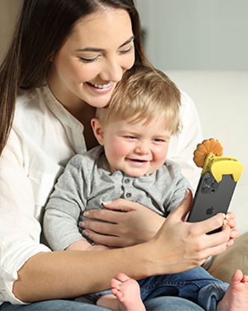 Our lion phone clip accessory spins, rattles, and hugs your phone camera’s shutter to draw eyes and baby attention directly to you.