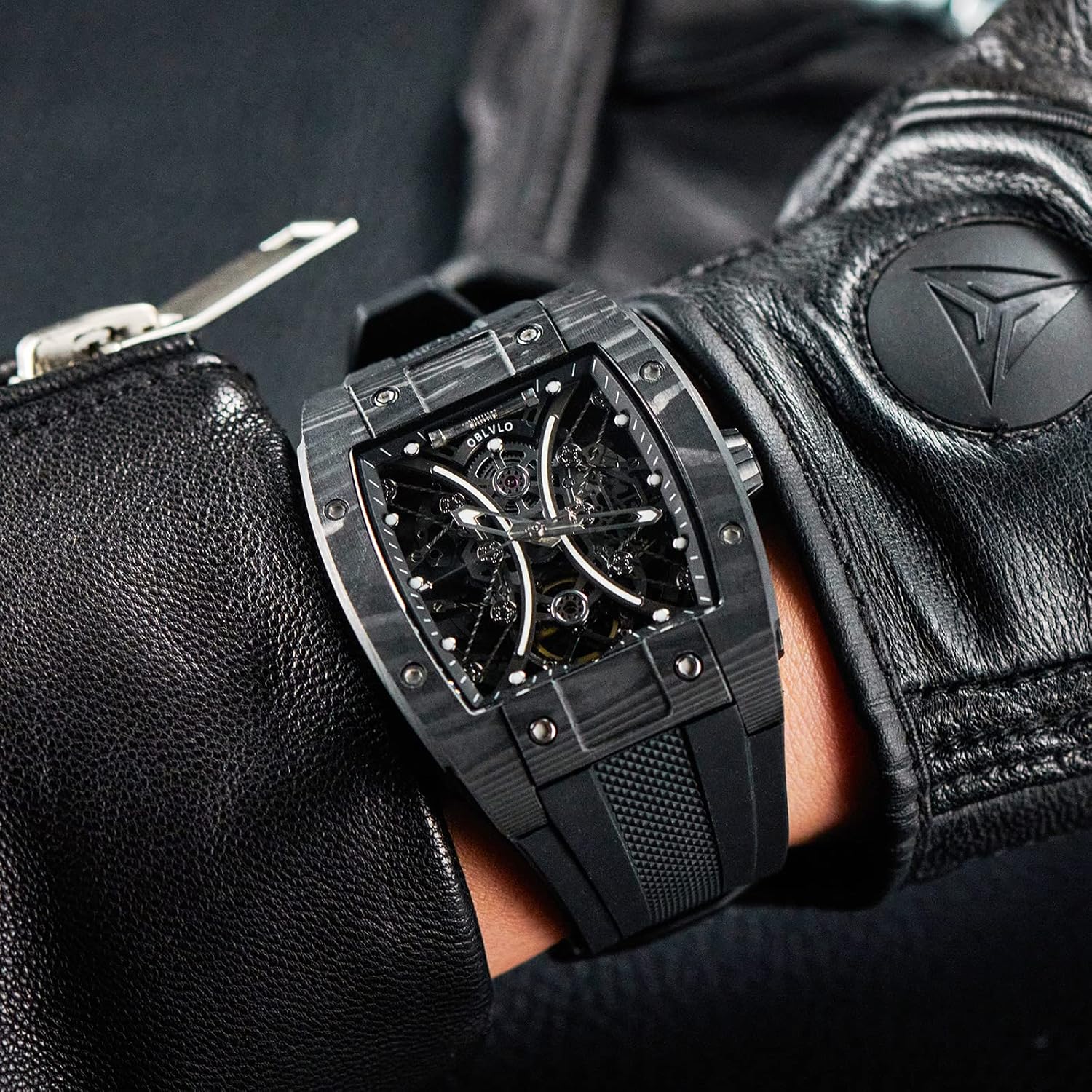 Luxury Brand Sport Watch for Men Square Tonneau Skeleton Steel Carbon Fibre Automatic Mechanical Watch Rubber Strap Watches EM-S