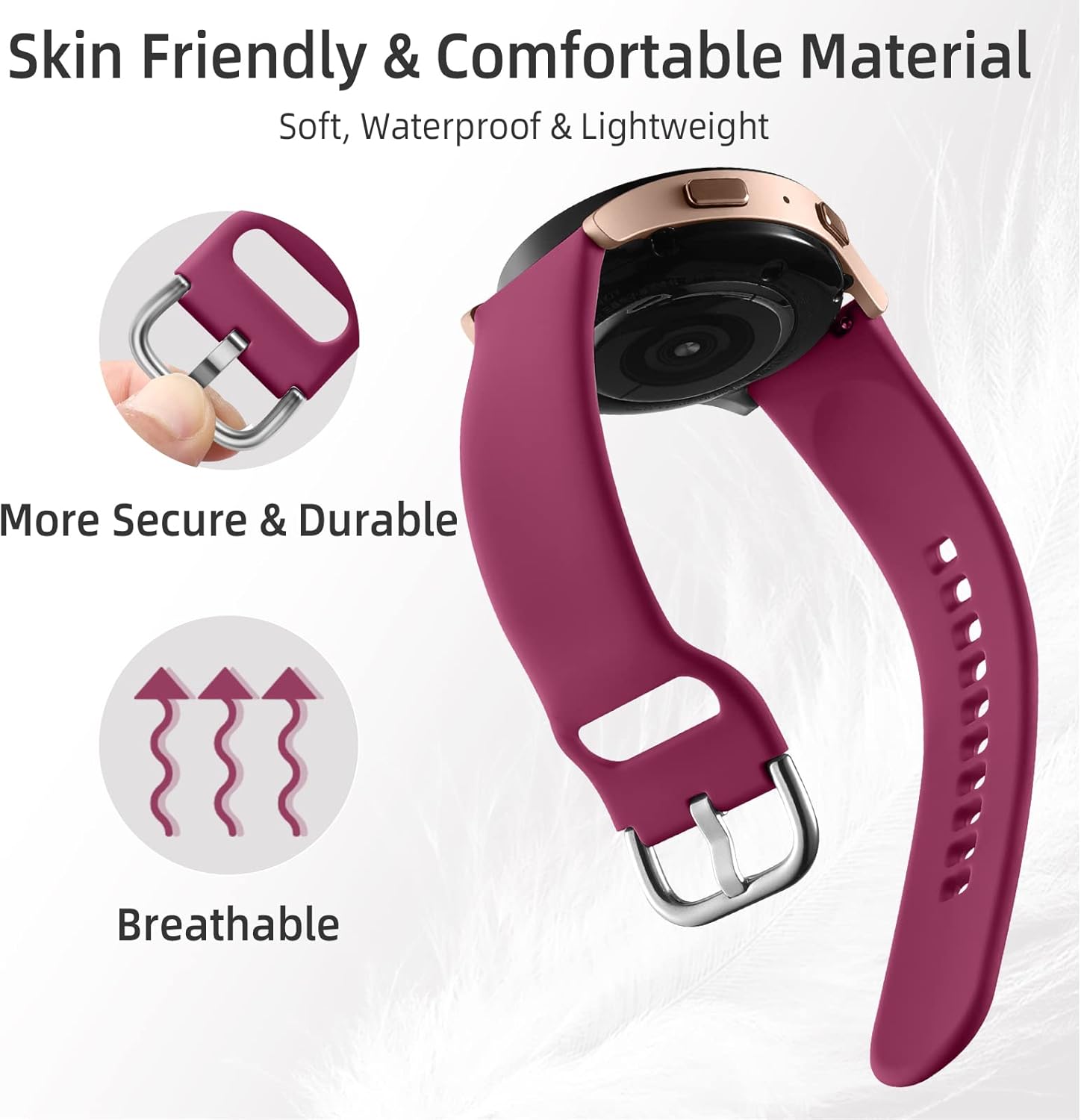 The stylish durable bands for Samsung Active 2 Watch are made of silicone material, NO skin irritation; Super soft, flexible, breathable, sweat-resistant and water-proof, bring you a great wearing experience. The best companion in daily time, workouts and overnight sleep.