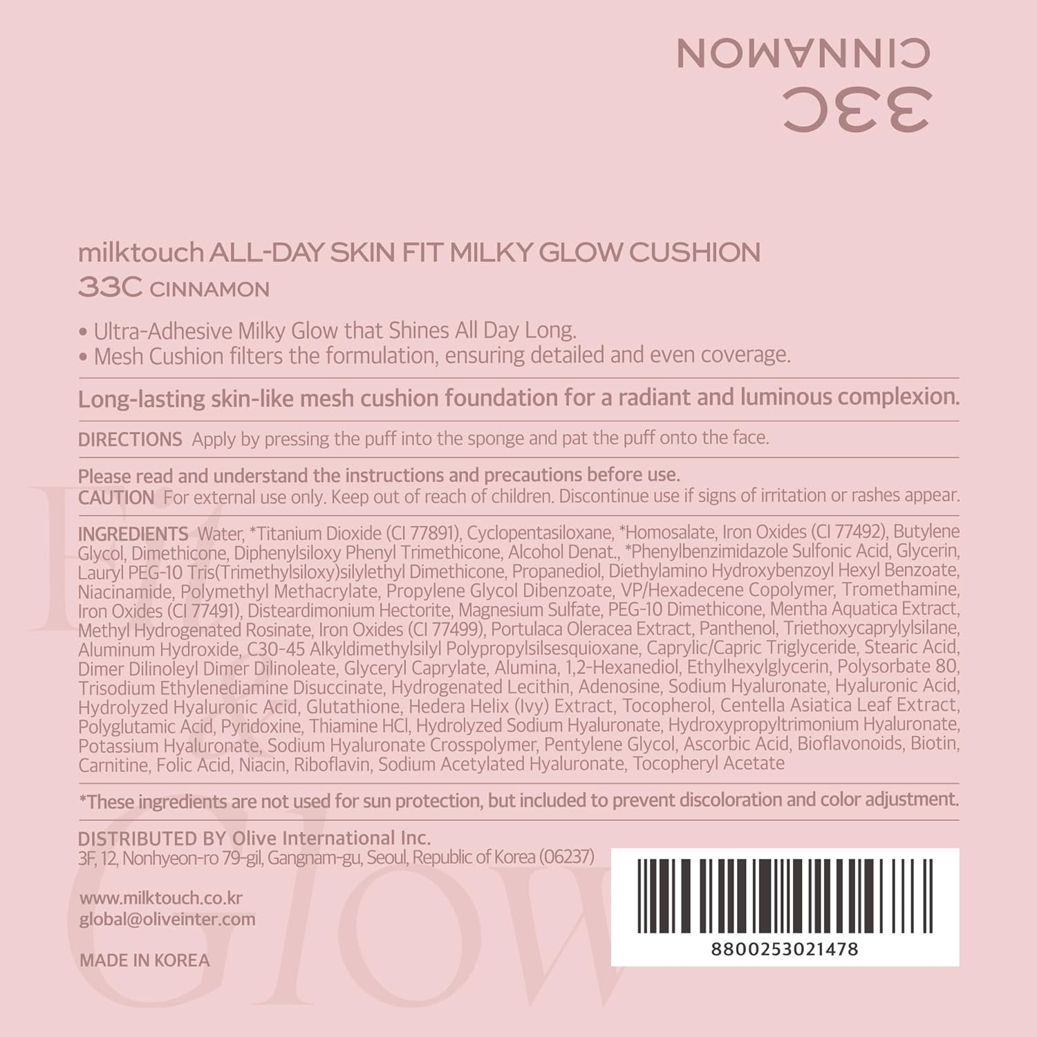 milktouch Cushion Foundation, 24H Flawless Skin, Radiant Shine, No Oxidation, Long-Lasting, Non-Creasing, 60% Hydrating Skincare Infused Korean Foundation, Valentines Gifts (33C Cinnamon)