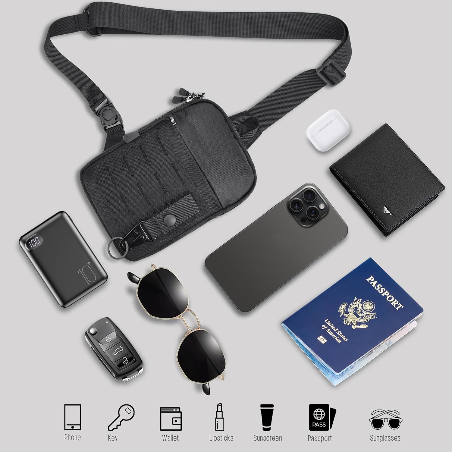 Outdoor Mastery: Tackle hiking, camping, cycling, or festivals with gear secured via MOLLE webbing.Daily Dominance: Compact size (5.9”x8.7”, 0.25lbs) fits essentials without bulk—ideal for gym sessions, errands, or travel.Tactical Versatility: Wear crossbody, chest, or waist-style for hands-free mobility.