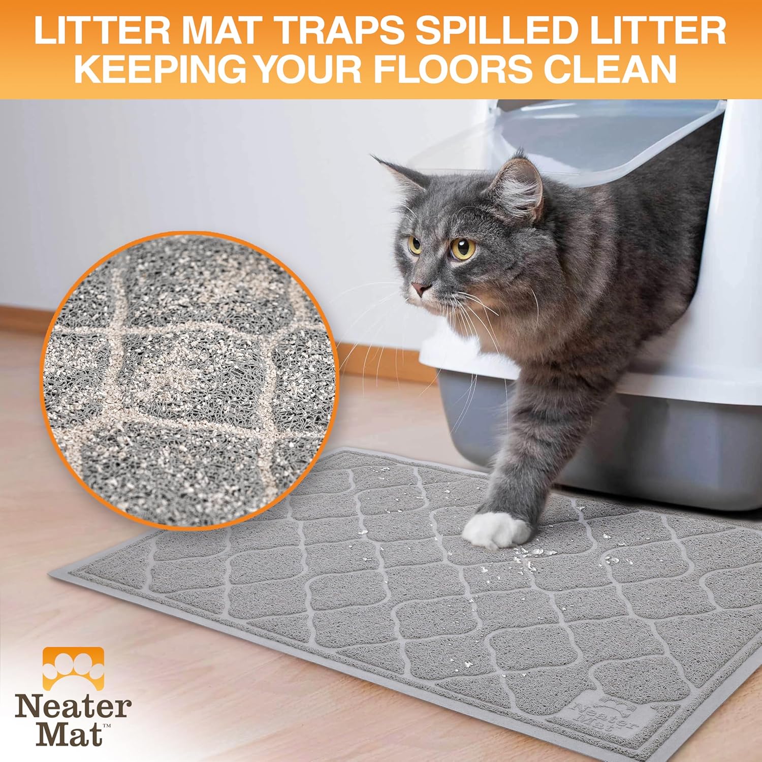 Neater Pets Neater Mat Cat Litter Rug, Thick & Durable Cat Mat for Litter Box, Trapper Pad Catches Mess to Protect Indoor Floors, Soft on Kitty Paws, Anti-Skid Grip Backing, Easy to Clean, Grey