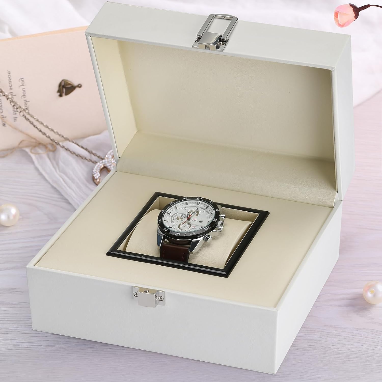 Exquisite Craft: This luxurious men’s watch case is exquisitely crafted and stylish in design, with careful stitching and bonding, and is lined with a smooth and soft beige PU leather that enhances the elegance of the watch, soft-yet-supportive pillows fit most sizes and styles of watches, keeping them in good shape, the strong metal buckle not only provides security for the watch case, but also decorates the entire watch case, allowing the watch case to improve the level