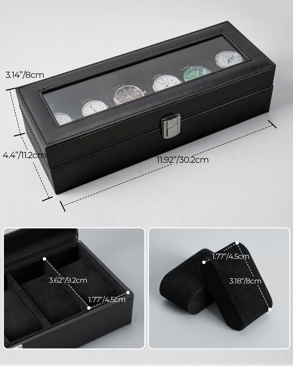 Ohuhu Watch Cases for Men, Watch Box 6-Slot PU Leather Real Glass Lid – Jewelry Organizer Storage Soft Velvet Watch Holder Display Case for Women Birthday