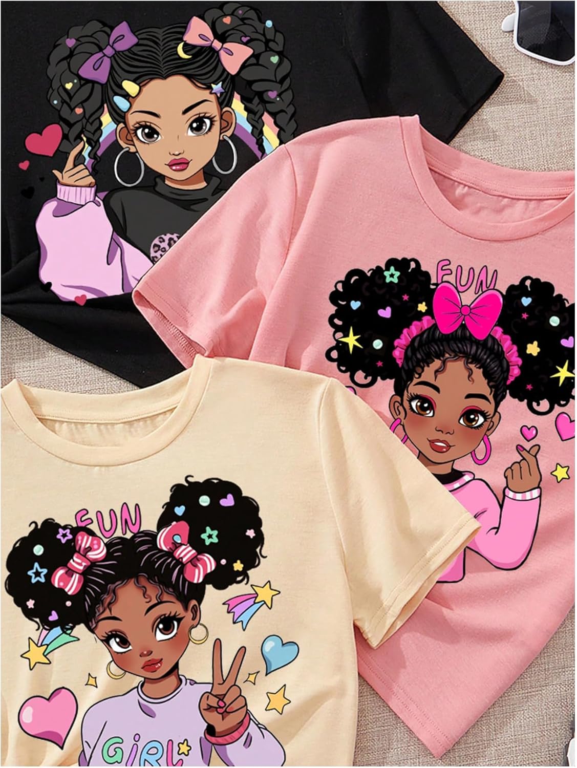 OYOANGLE Girl’s 3 Pack Graphic Print Cartoon T Shirts Crew Neck Short Sleeve Cute Casual Tee Tops