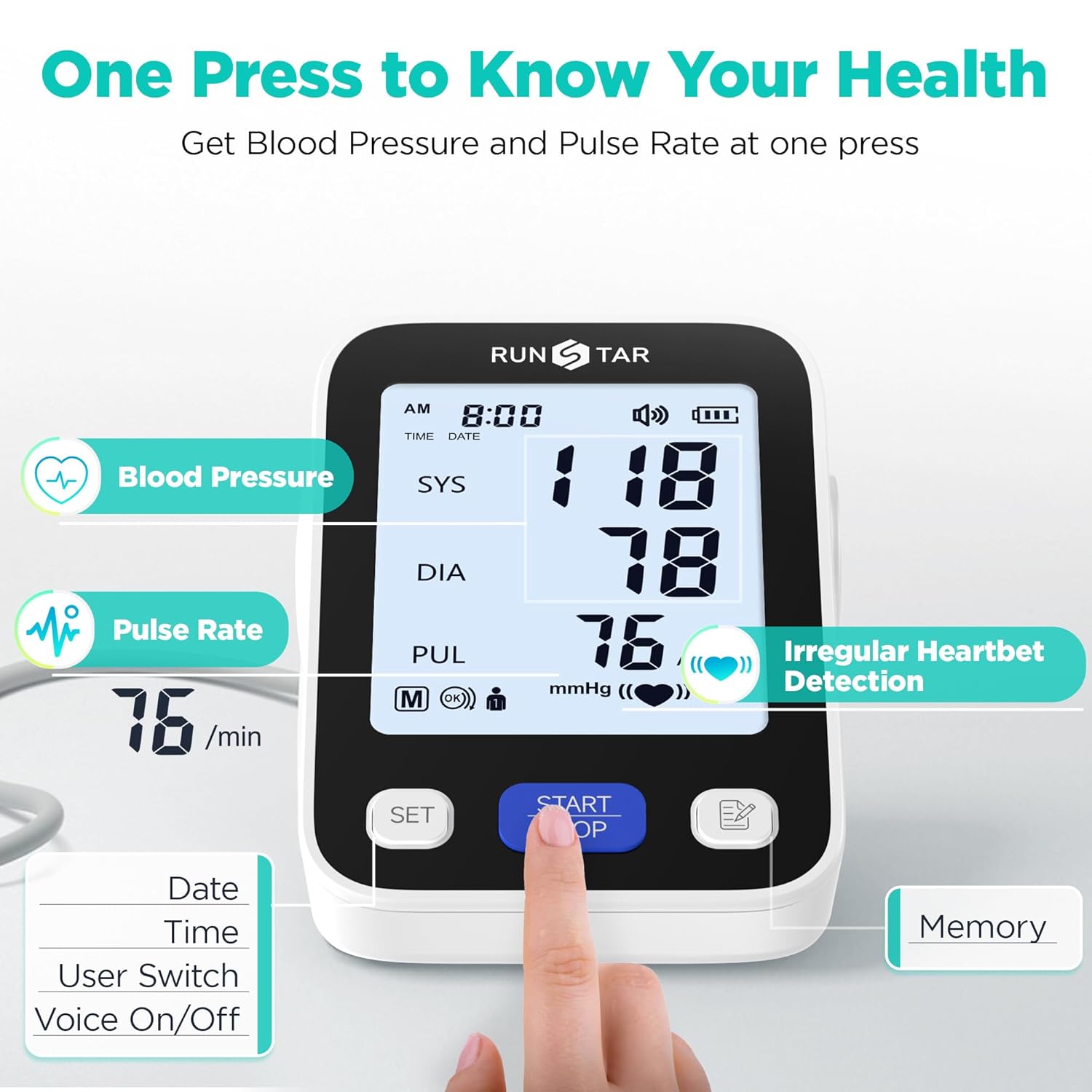 [One Press to Know Your Health] With just a single press, runstar blood pressure machine can give you detailed readings of both your blood pressure and pulse rate, helping you keep track of your heart health. It also has the ability to automatically detect and notify you of irregular heartbeats by showing a warning symbol on display