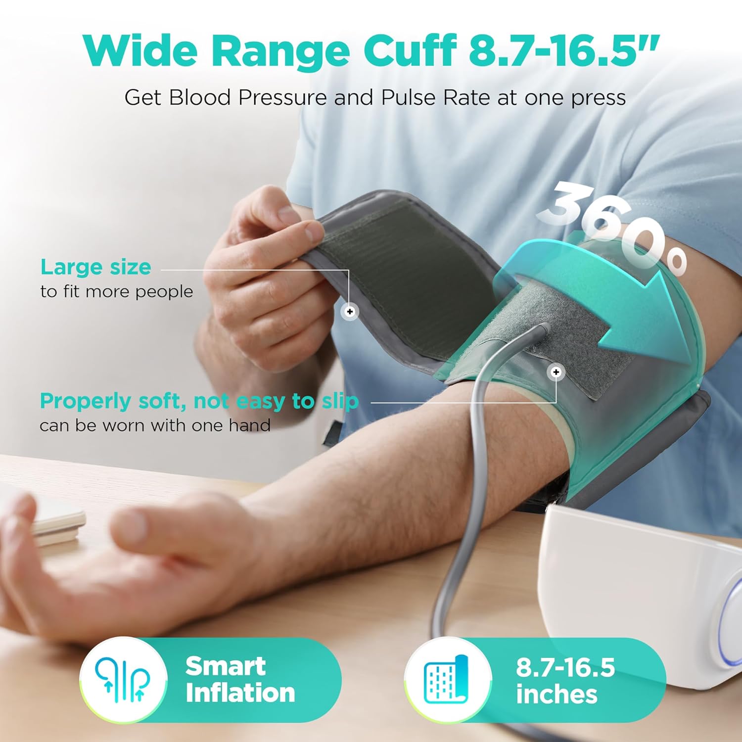 [Universal Comfort with Smart Inflation] The cuff is designed to be soft and comfortable, measuring 8.7 x 16.5 to fit various arm sizes. It can easily be put on with one hand and stays securely in place without slipping off. Runstar BP monitor includes cuff detection to alert you on the display if the cuff is not worn correctly or too loose