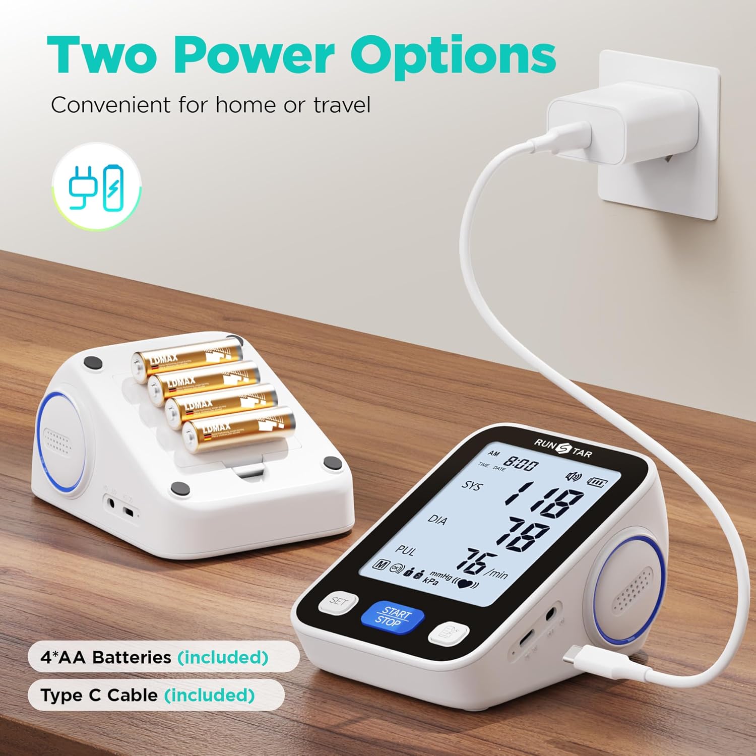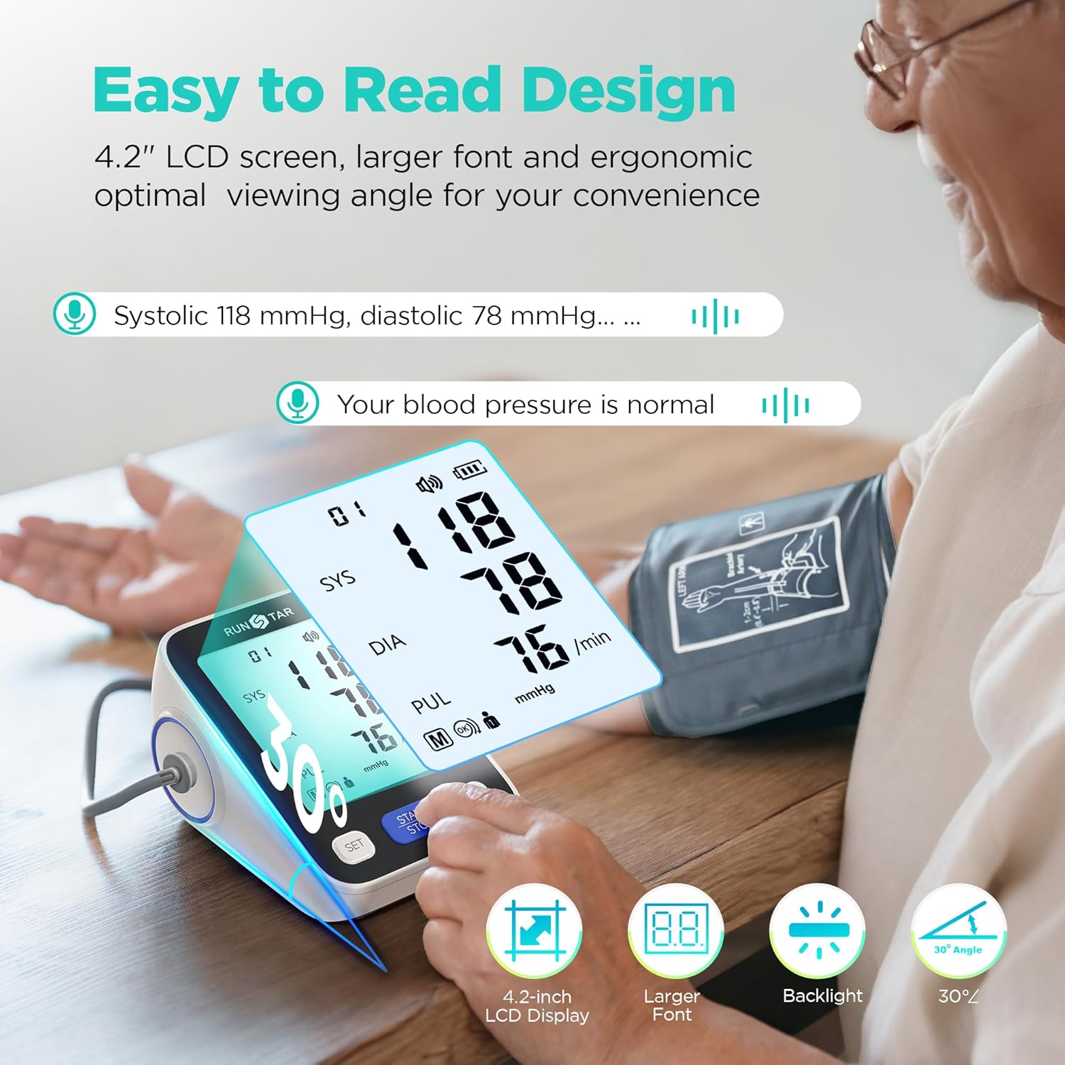 [Large & Loud for Seniors] Runstar Upper Arm BP Monitor is user-friendly for seniors, featuring an ergonomically designed large 4.2″ LCD display that is angled at 30° for easy viewing, along with soft backlighting and large fonts for clear readability. Additionally, it features voice broadcast (which can be turned off) to assist those with limited vision in accessing their health measurements
