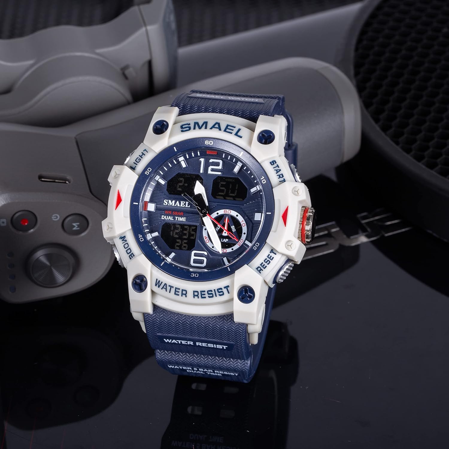 Product description: 1. Brand: SMAEL 2. Dual time shows with LED backlight function 3. 50M Water Resistant 4. Type: Men Sports Watches 5. Movement: Japan Original Digital Movement 6. There are 9 colors for selection 8. Band Width: (approx) 2.2cm 9. Dial Diameter: (approx) 5.4cm 10. Strap Material: Strong PU 11. Case Material: Strong Rubber + High Strength Hardened Glass 12. Clasp: Buckle 13. Showing precise time 14. It is good gift for someone special Note: we suggest you not wear it when swim .but if you go to swim or dive , pls don’t press any button underwater! Components Included: -1 x Genuine SMAEL Watch -1 x Use Manual -1 x Gift Box