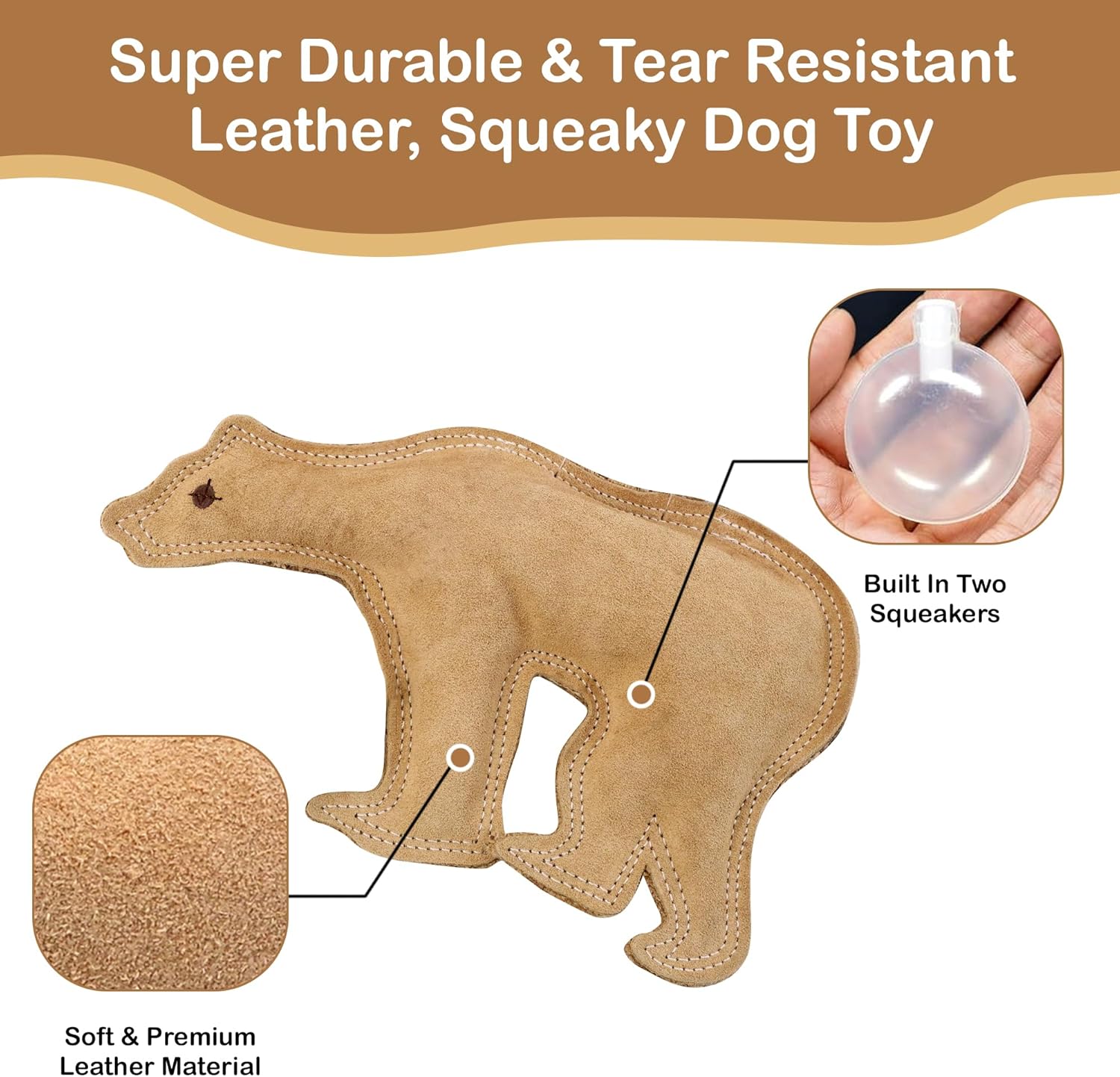 Made with real leather with double stitched seams and jute backing for extra strength to withstand your dog’s chewing. With a squeaker inside for extra entertainment.