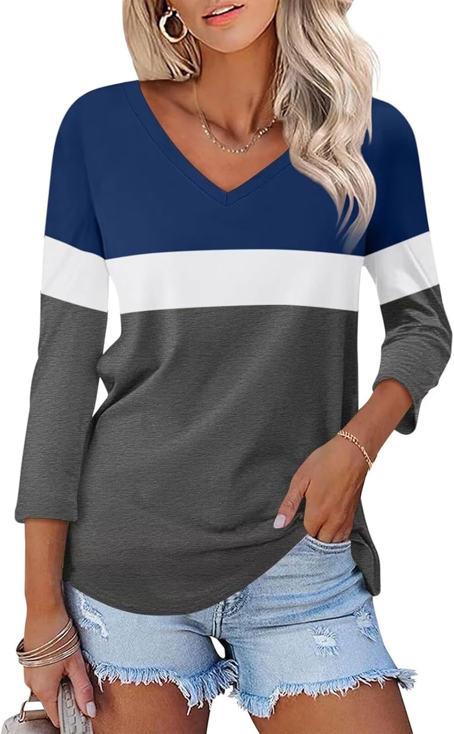 Work Blouses for Women,Women’s 3/4 Length Sleeves V Neck Color Block Tops Shirts Basic Summer Ladies Graphic Tees