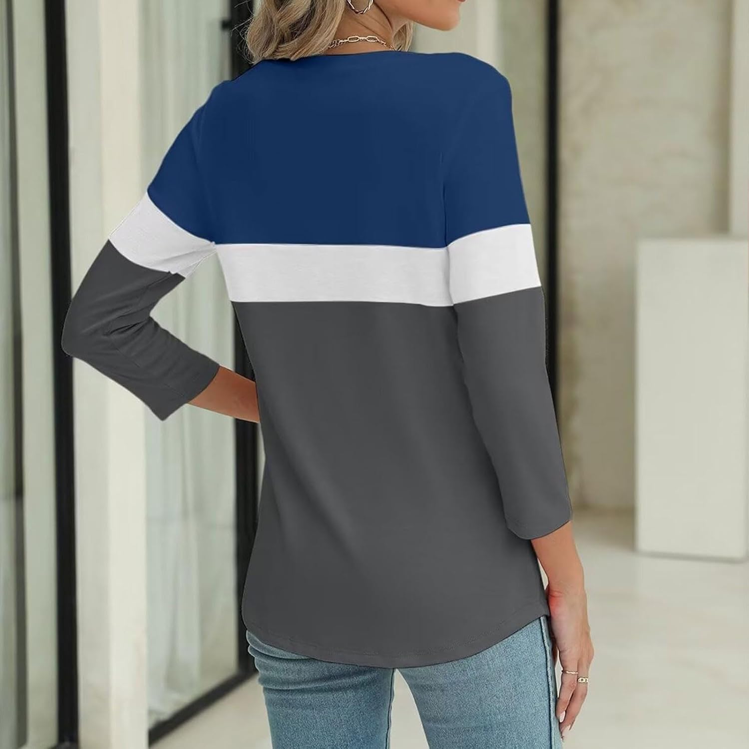 Work Blouses for Women,Women’s 3/4 Length Sleeves V Neck Color Block Tops Shirts Basic Summer Ladies Graphic Tees