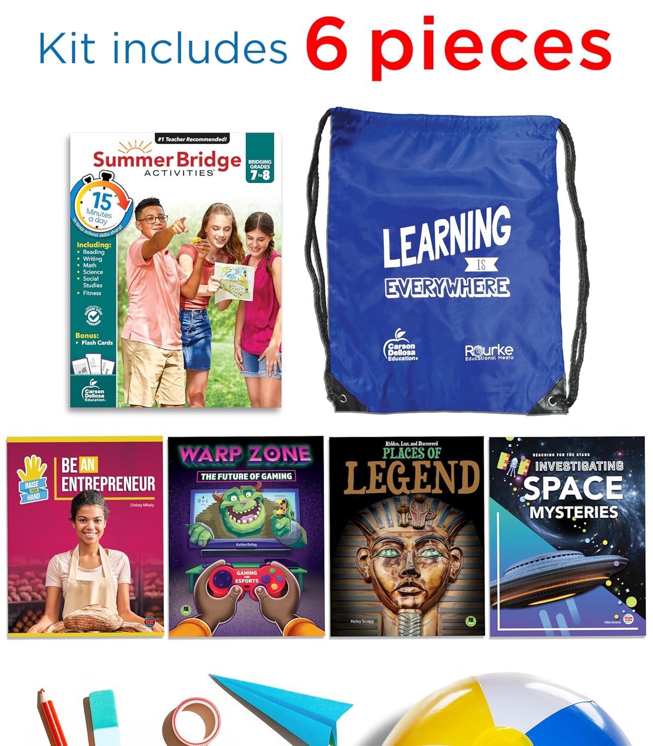 Engaging and educational active learning adventures. Students can practice their reading comprehension skills with the included children’s books. The Summer Bridge Activities 8th grade workbook features reading comprehension, math, science, language arts, and handwriting activities, and includes flash cards and fun fitness activities, too!On-The-Go Learning Fun. Each bundle is stored securely in the durable drawstring bag so your child can practice skills on-the-go. Practice during long road trips, downtime during the summer, and more.
